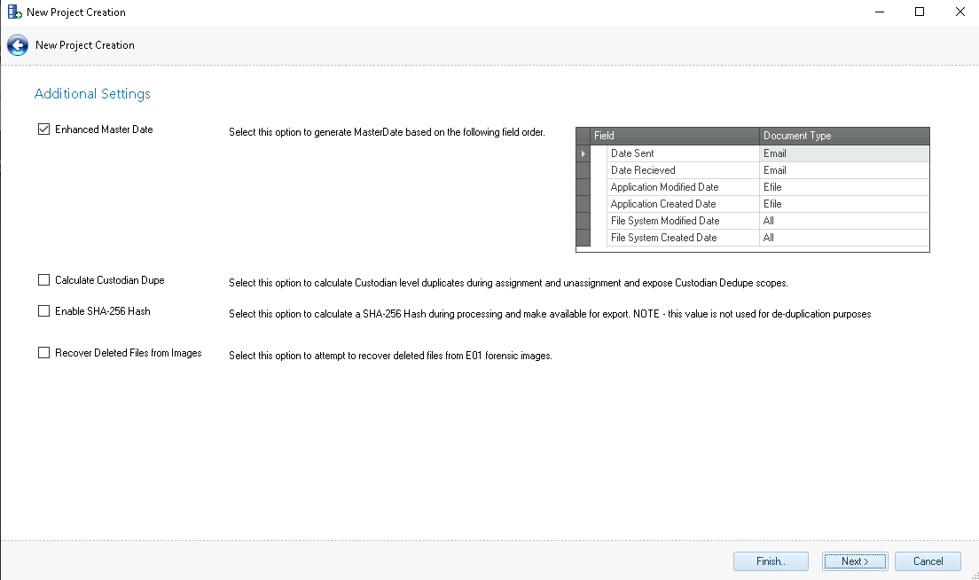Enable SHA-256 Hash - Will calculate SHA-256 Hash during processing and make it available for export.