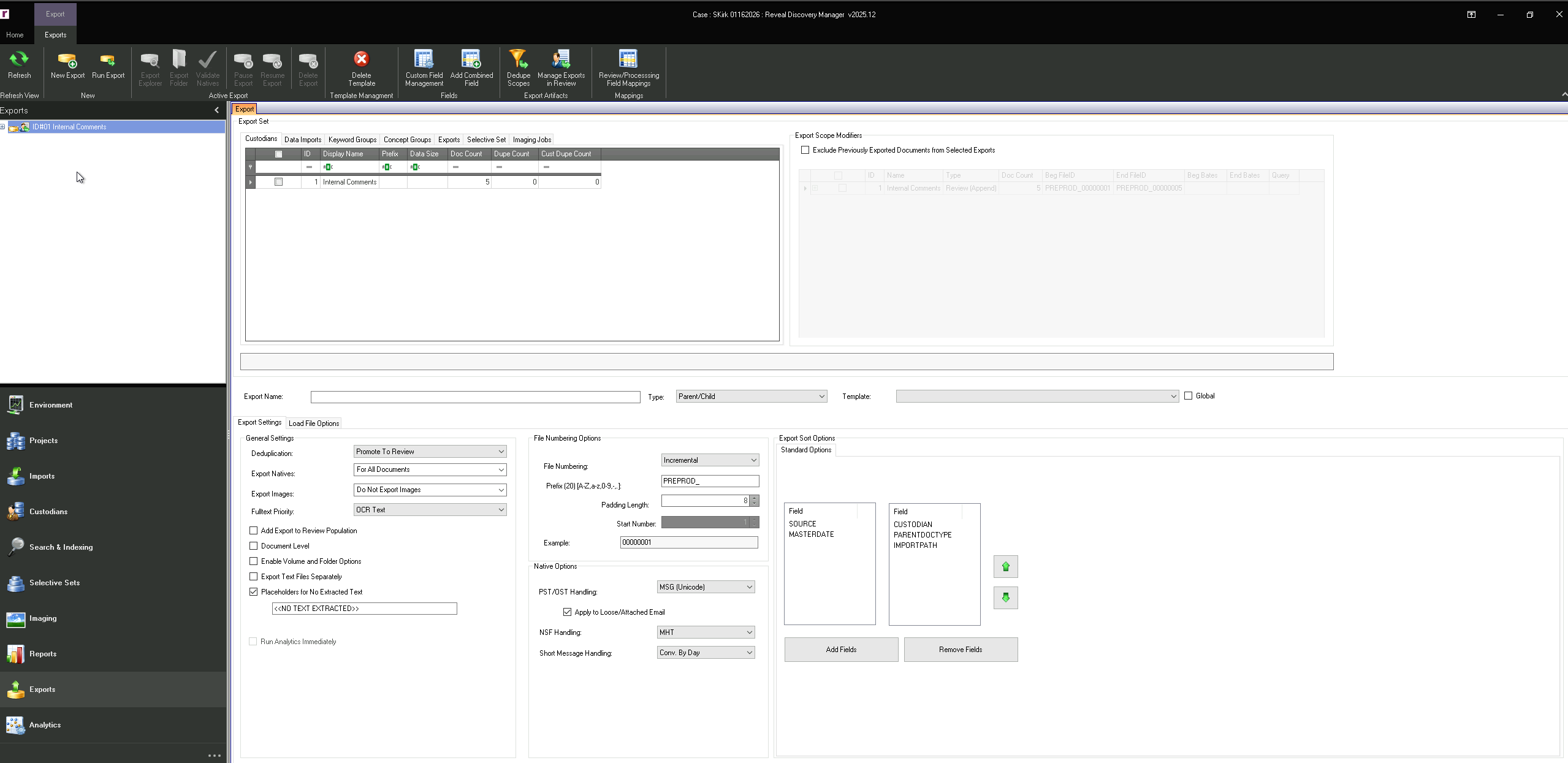 Export Sort Options – By default, exports are sorted by CUSTODIAN, PARENTDOCTYPE, IMPORTPATH. To change the sort order of the export, add the fields in the order in which the export should be sorted.