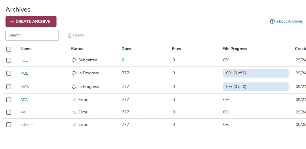 The archive will show up at the top of the list with a rotating icon and “Submitted” status. Reveal may take a couple minutes to process this request, after which the job status changes to “In Progress” and a blue progression bar with “0% (0 of 0)” appears under the File Progress column.