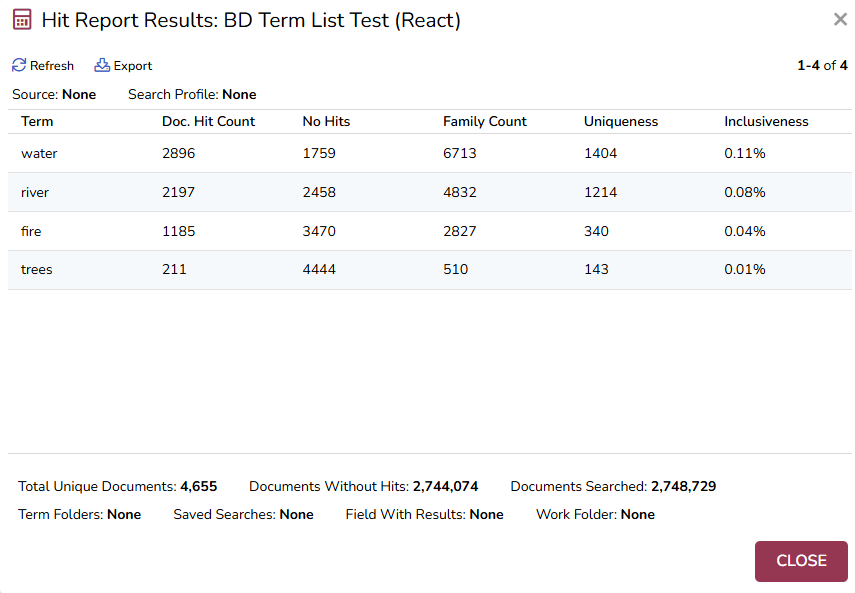 In this modal, there are additional metadata results included found by all of the Search Terms, such as Source, Search Profiles, Total Unique Documents, Documents Without Hits, Documents Searched, Term Folders, Saved Searches, Field With Results, and Work Folders.