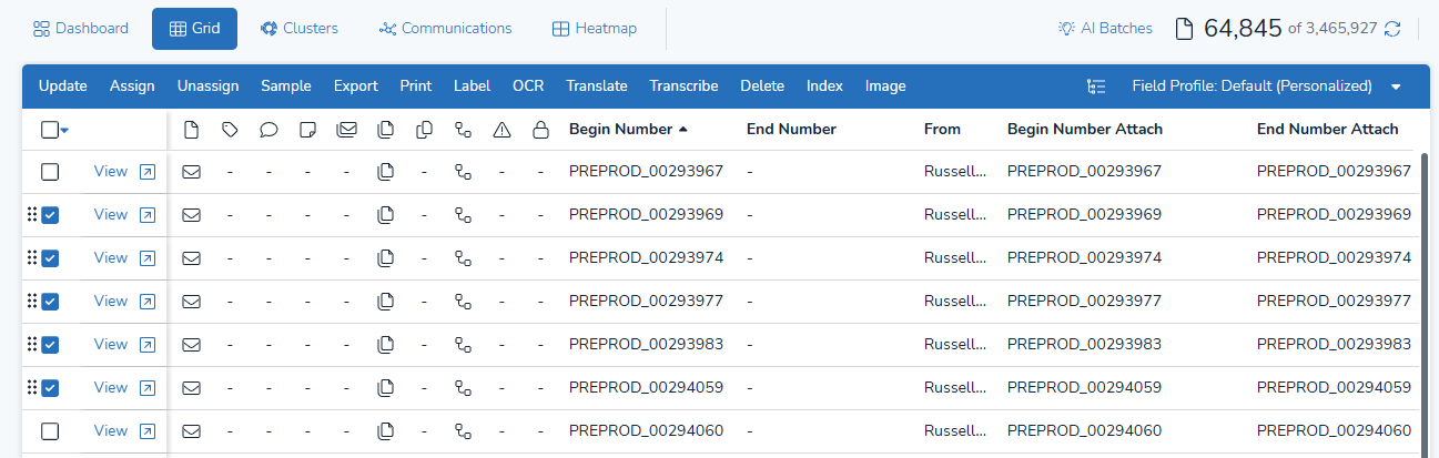 1. In Reveal’s Grid view, search or filter or directly select the documents to be indexed.