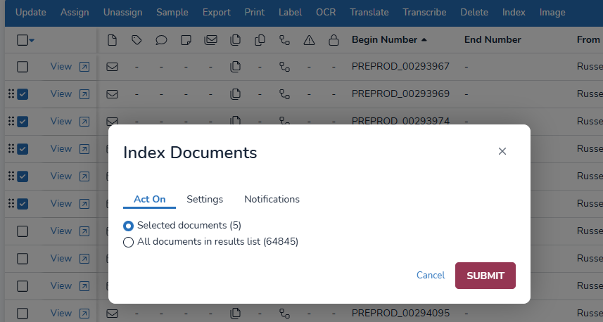 3. In the Index Documents window, select the set of documents (Selected documents or All documents in results list) to Act On.