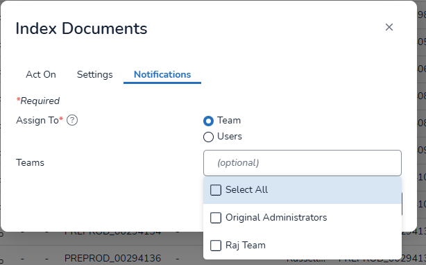 1. Notifications sets who should be updated about the status of the indexing job, selected Team or selected Users.