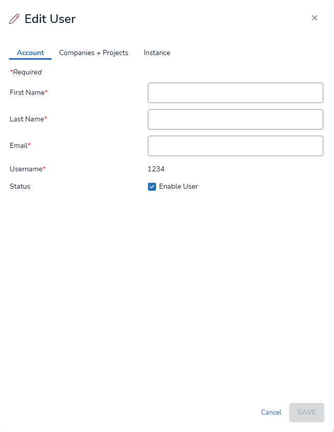 for that user. This brings up the Edit User window, where information can be changed for the Account, Companies + Projects, and Instance tabs.