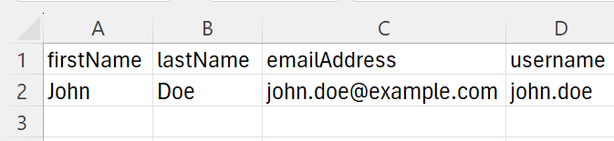 Download template. The CSV file must have these column lineup: First Name, Last Name, Email Address, and Username. Note