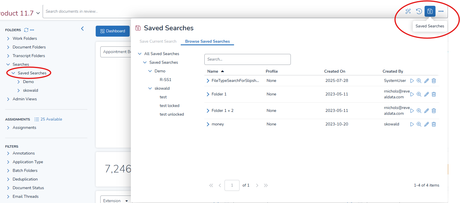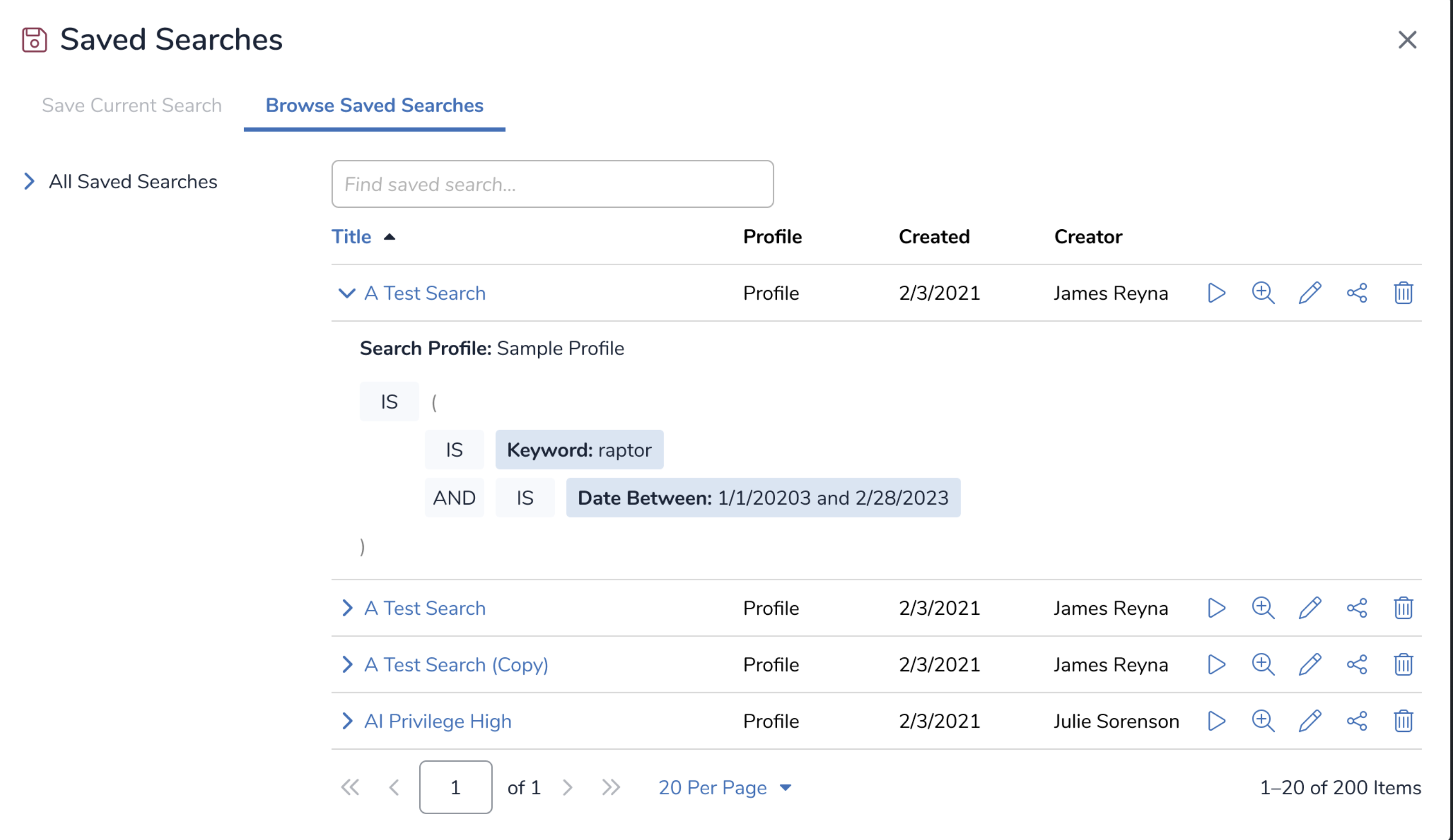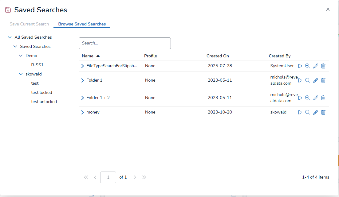 Open the Saved Searches pop-up by clicking on the button in the Search Bar and selecting the Browse Saved Searches tab. This will open the Saved Searches pop-up to list All Saved Searches.