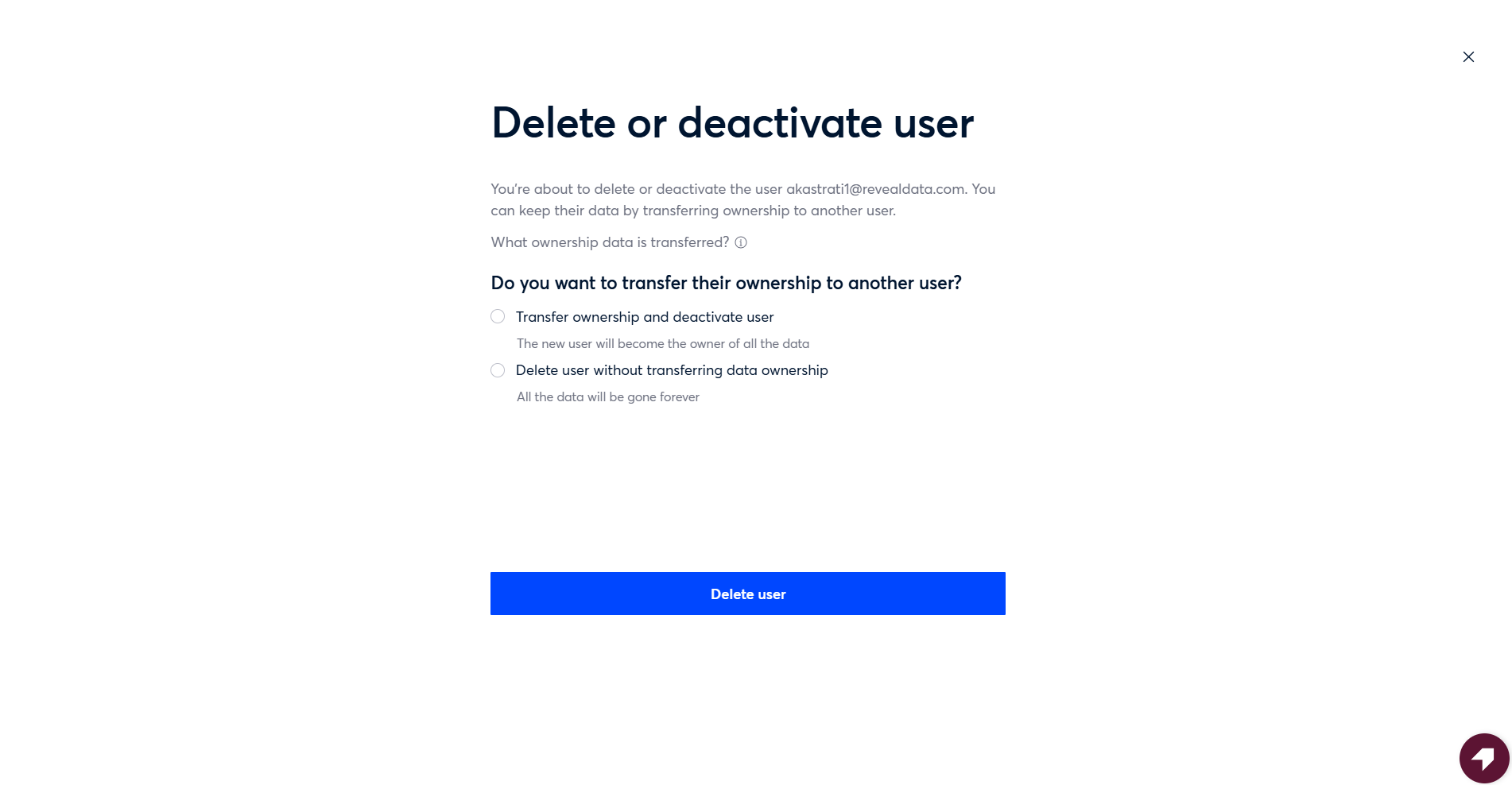 If you select Delete user without transferring data ownership, all data associated with that user will be permanently lost and cannot be recovered.