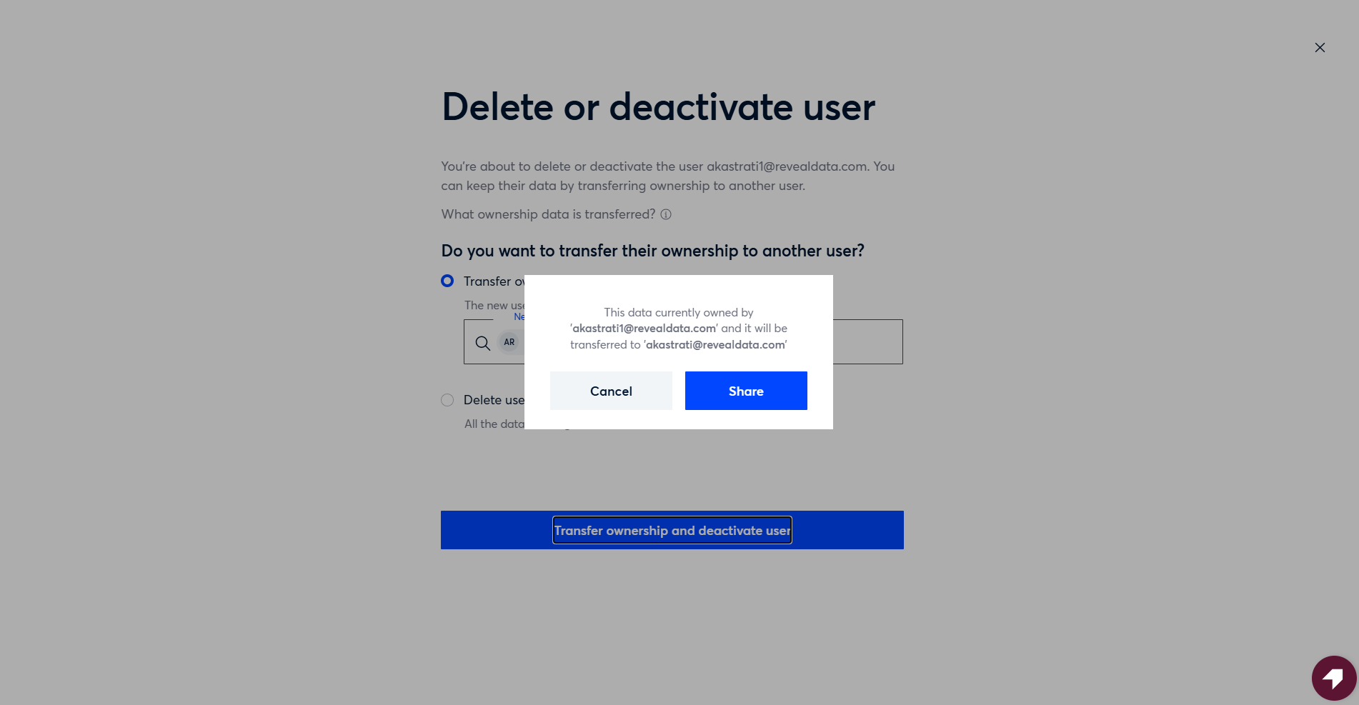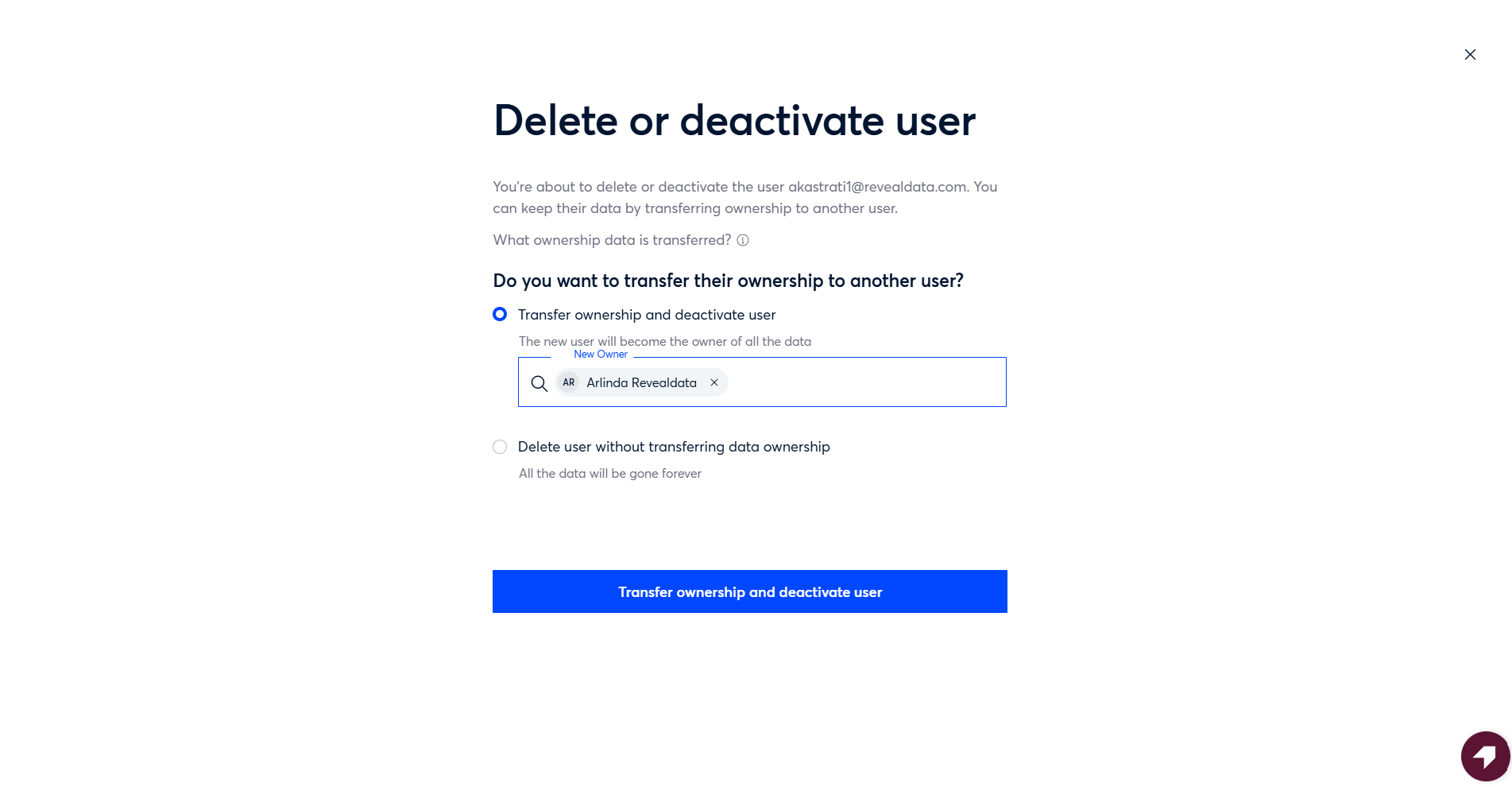 Transfer ownership and deactivate user — the selected new user will become the owner of all the data.