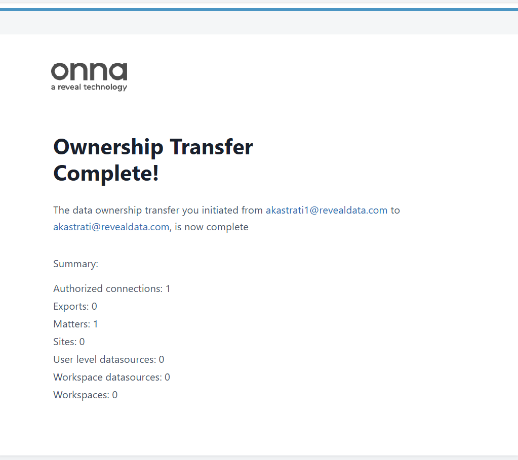 Ownership can be transferred individually or in bulk. All transfers are logged for auditing purposes, and email notifications are sent to confirm successful transfers.