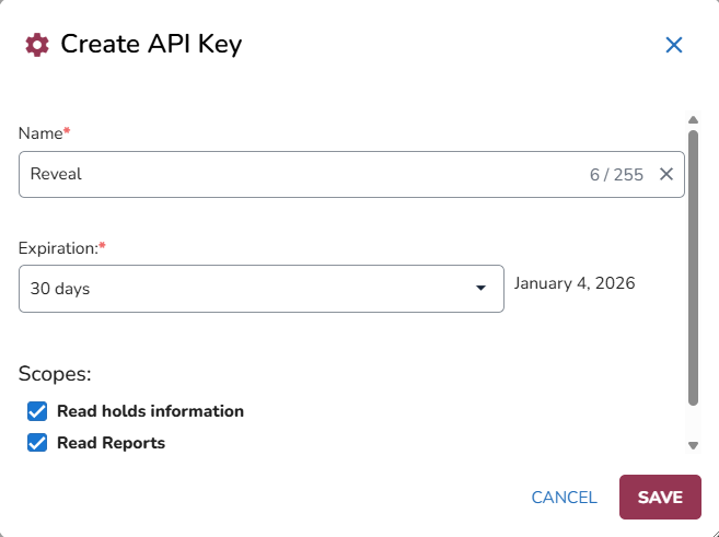 Scopes: Will default to two available scopes - Read Reports and Read holds information.