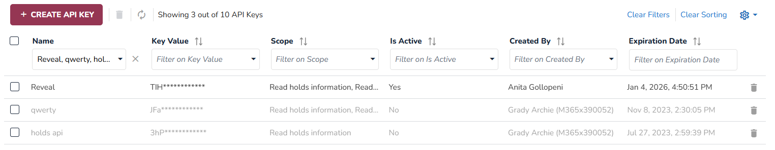 The API window will appear . You will be able to view and filter the Name, Key Value, Scope, Active status, Created By and Expiration date.