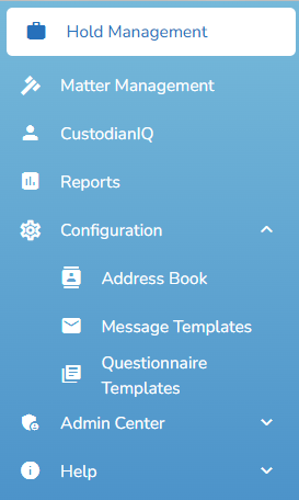 Via the Configuration button in the menu on the left side, you can access three different configuration pages: Address BookMessage TemplatesQuestionnaire Templates