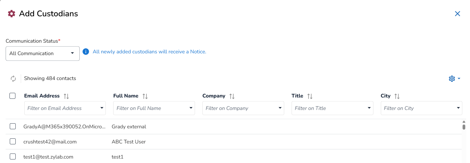 All custodians listed here, are imported from the Address Book. When contact information needs to be updated, you need to do that in the Address Book.By default all custodians are added with the Communication Status set to All Communication. You can change that here or after adding the custodians.