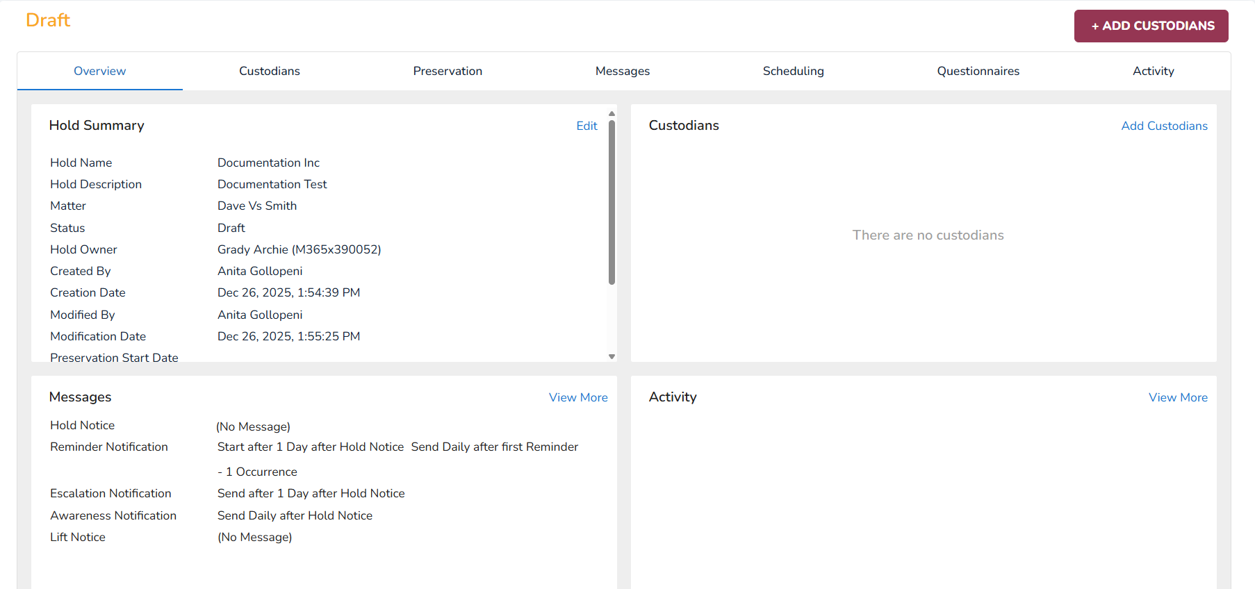 You can also add custodians via the button in the Custodians tab or via the Add Custodians link in the Overview tab.