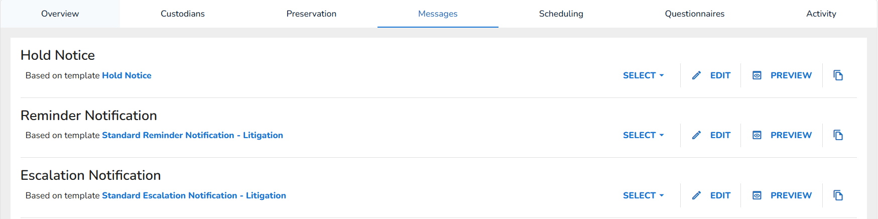 or, select the Messages tab and define a new message/select a Message Template for the Hold Notice. For all other messages, default templates have been selected already. Click Select to create a new message, edit the selected template, preview the message, or save the new/edited message as a new template.
