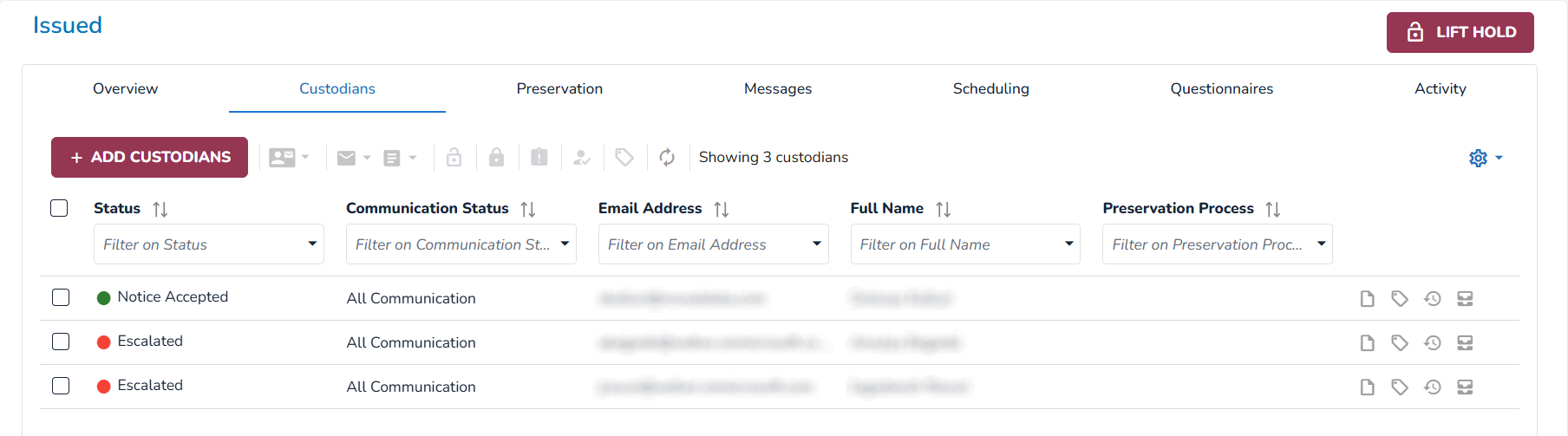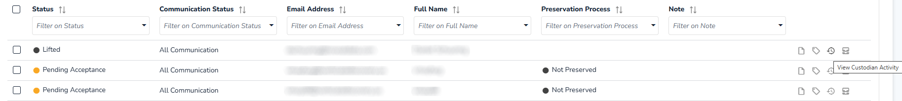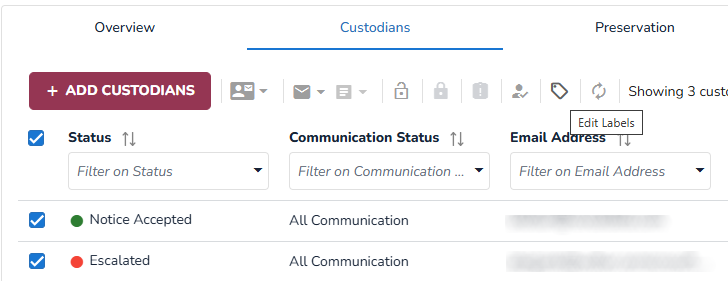 Keep track of custodian statuses and perform actions in the Custodians Tab of a hold.