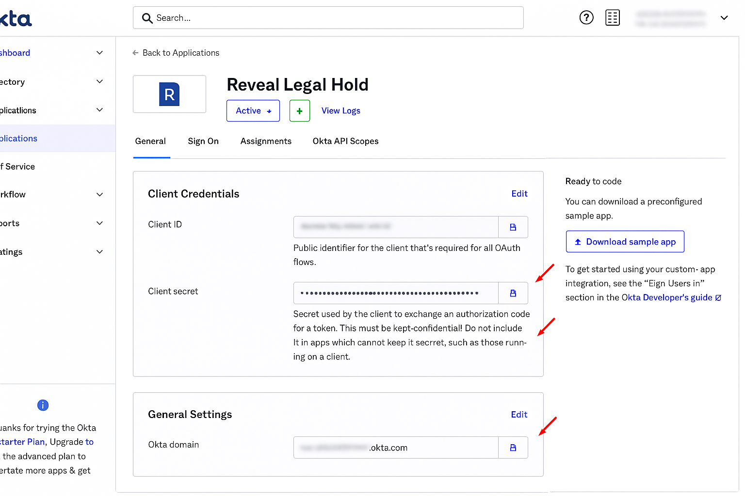 'Client ID' from application configuration in Okta (created in previous step), used to determine that it is the Reveal Hold integration when Reveal Hold does requests to Okta.