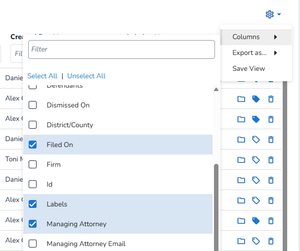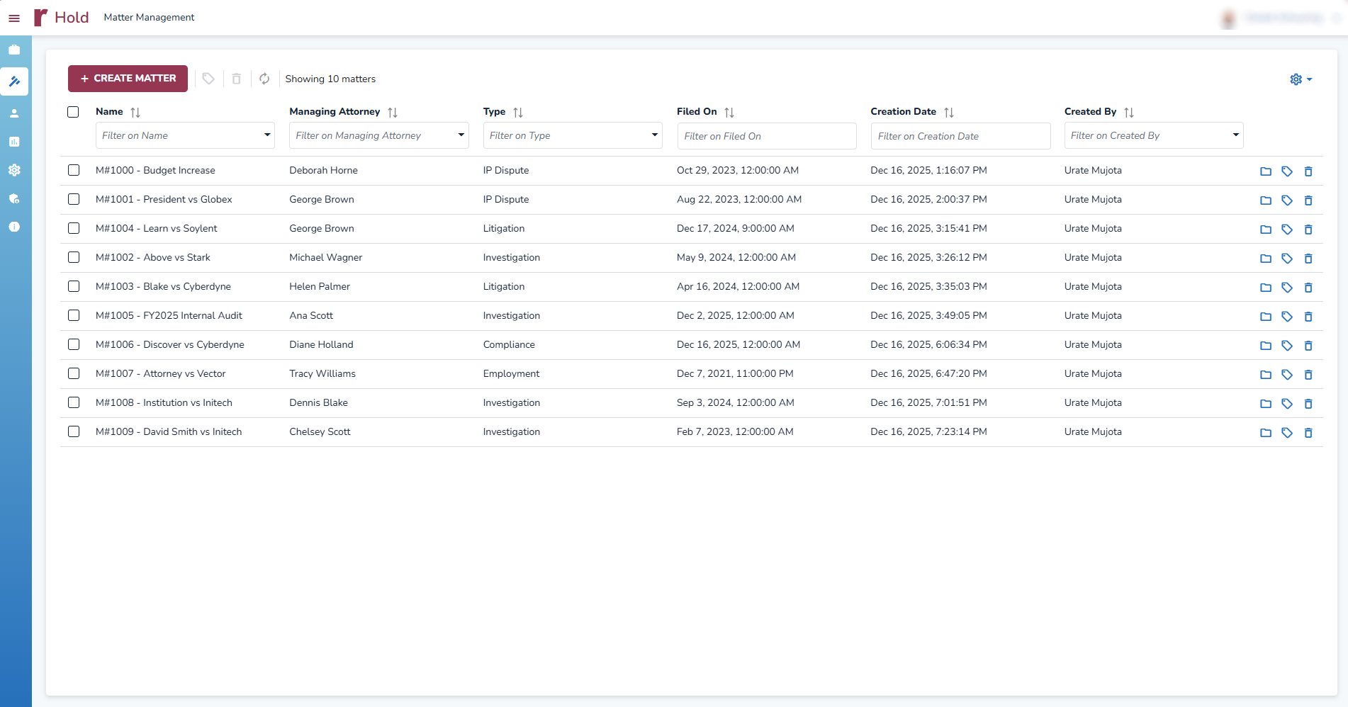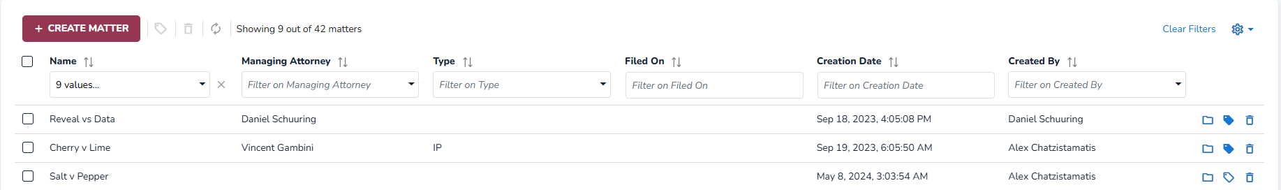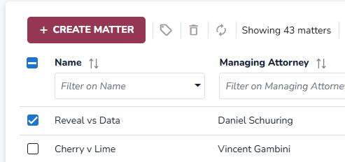(located at the end of the row).Delete multiple matters by selecting them and clicking the Delete selected Matters icon