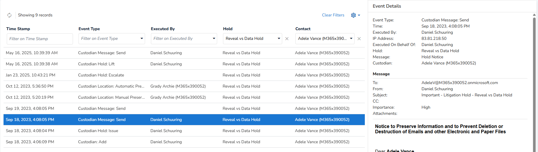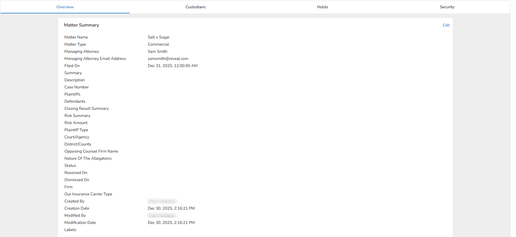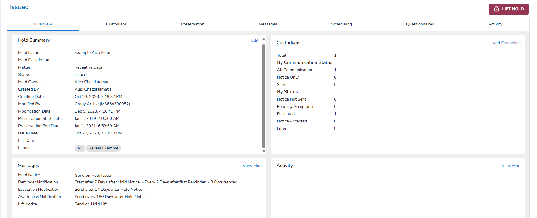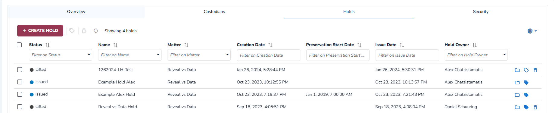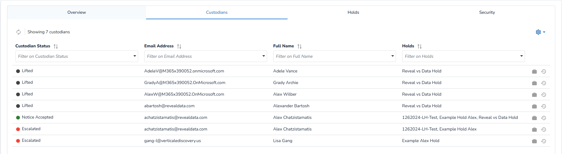 The Custodians tab is an overview of all custodians related to the matter. You can quickly view the custodian status and holds applied to each custodian.