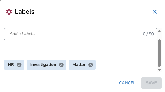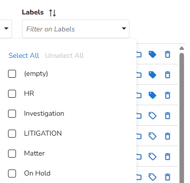 Labels help to organize matters, holds and custodians. You can quickly search and filter using labels.