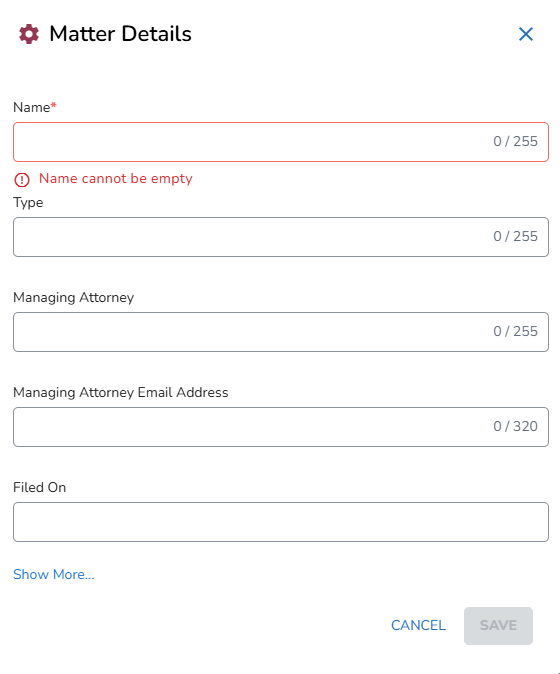 .Define the Matter Details. Only the Name is mandatory. Click Show More... to define more details.