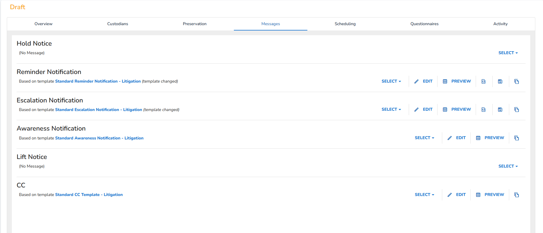 Initial message that describes the hold and informs the custodian. This message can include a questionnaire.Reminder Notification