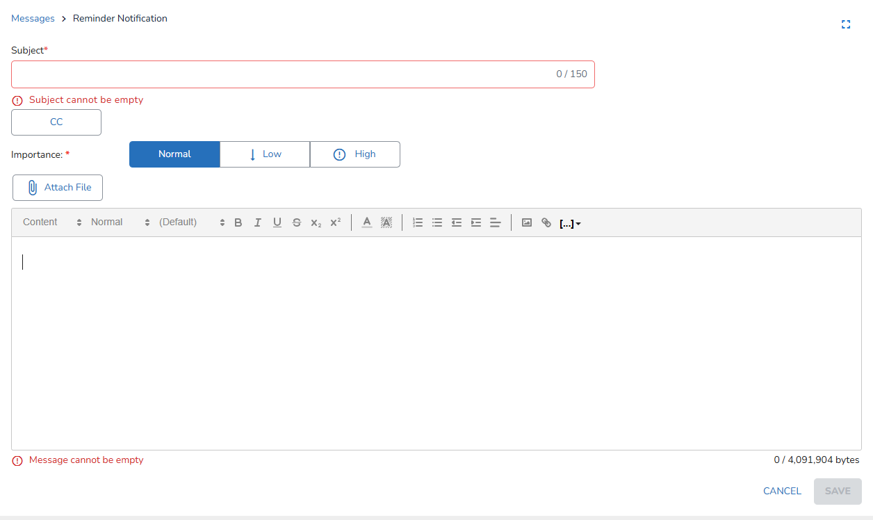 When creating a new message, it will be empty (see below). When editing a template, it will be filled with the selected template you want to change.