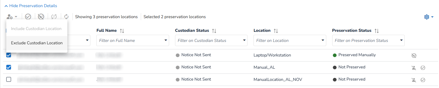 Select any of the blue links in each card to show the Custodian Details and filter the grid at the same time (for example, click the number behind 'To Do' to only view the remaining preservations for that location).Exclude multiple custodian/location-combinations via the button in the top left corner, or exclude a single custodian/location-combination via the Exclude Custodian Location button at the end of the row