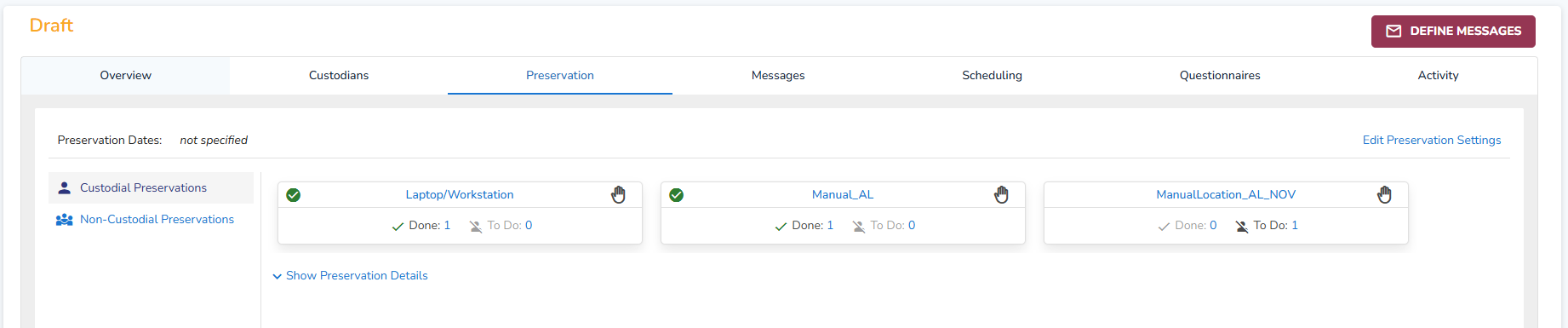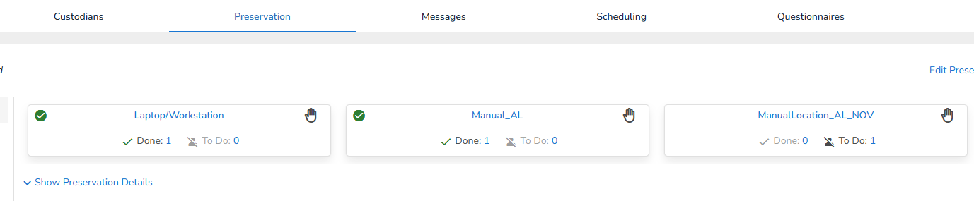 Each location is displayed on a card. Also, the number of custodians that are preserved (Done), that are 'In Progress' and that are still 'To Do' is shown.