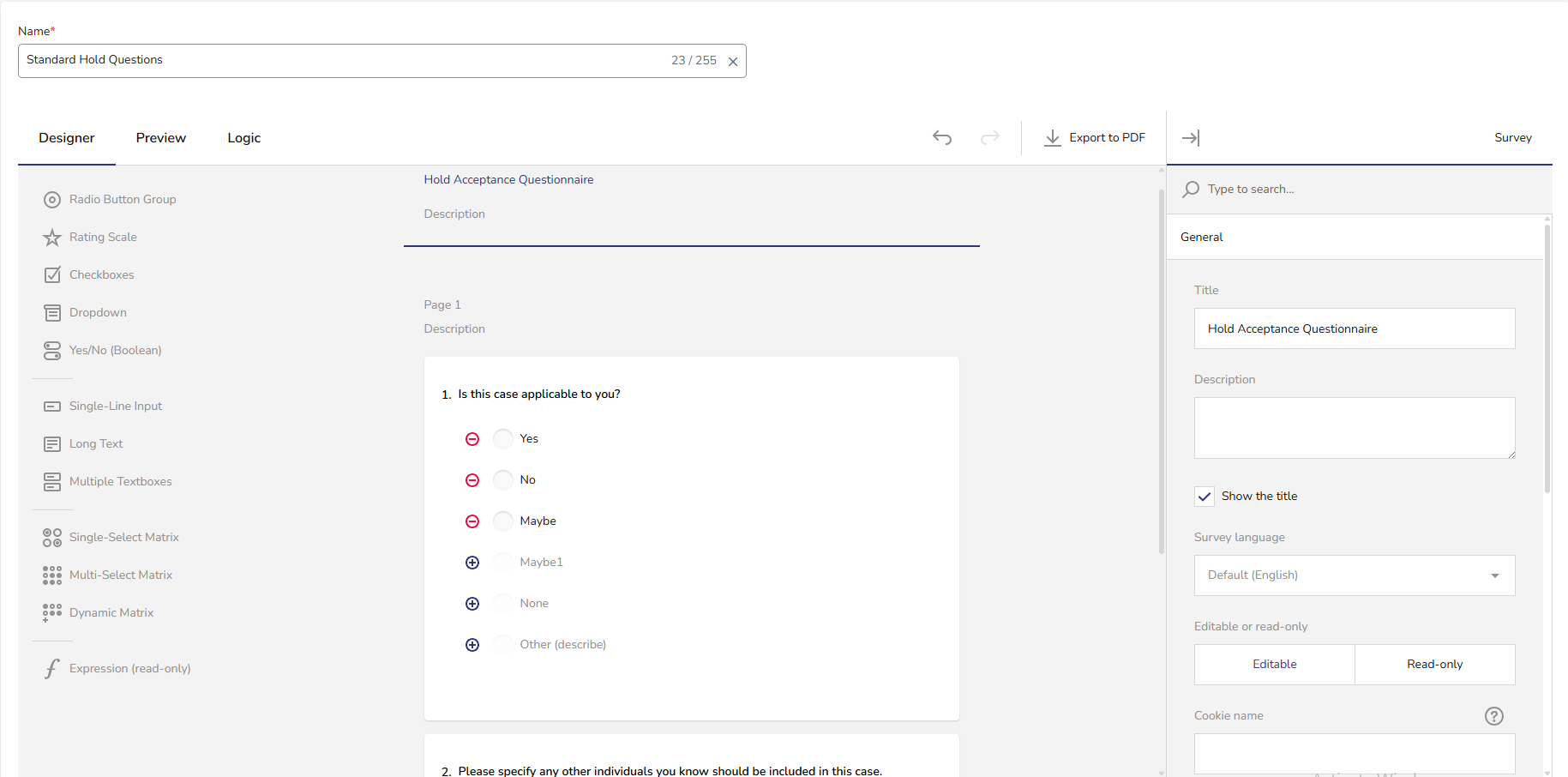 Edit the selected questions or export them as a PDF. In the Properties pane, define the settings for this survey, the pages and the questions. When finished, click Save. If not already a template, you can now save it as one.