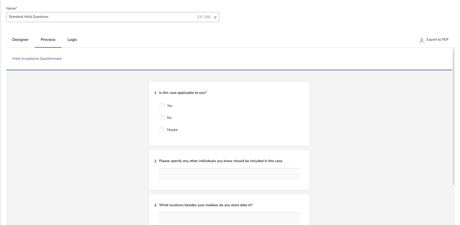 The Questionnaire Templates page contains all Questionnaire Templates that can be used for a hold. Questionnaire results help to get a better understanding of the data set and discover more sources of information.