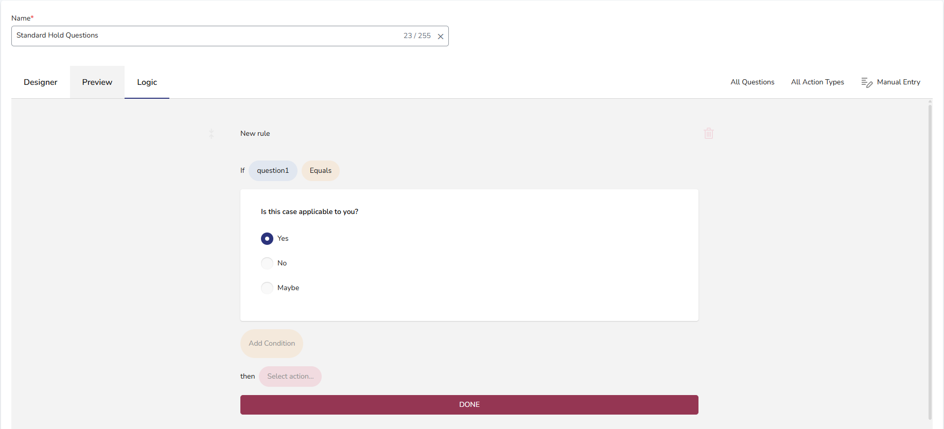 Create rules to customize the flow of the survey. For example, when a certain answer is given on a specific question, you might want the custodian to answer another selected question.