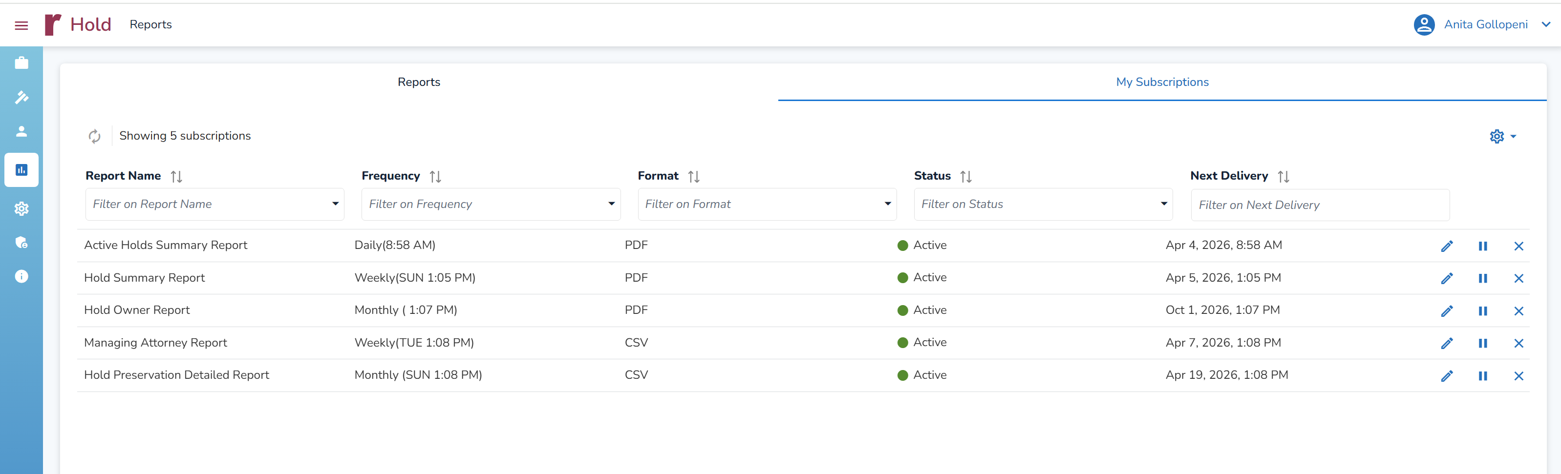 Users can view their Report Subscriptions in the My Subscription tab. They can see, search, and filter through the Report Name, Frequency, Format, Status, and Next Delivery.