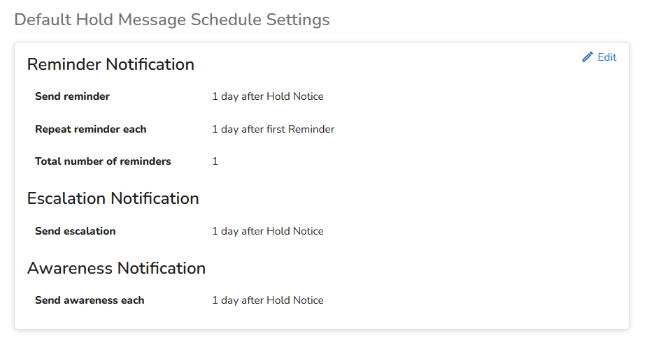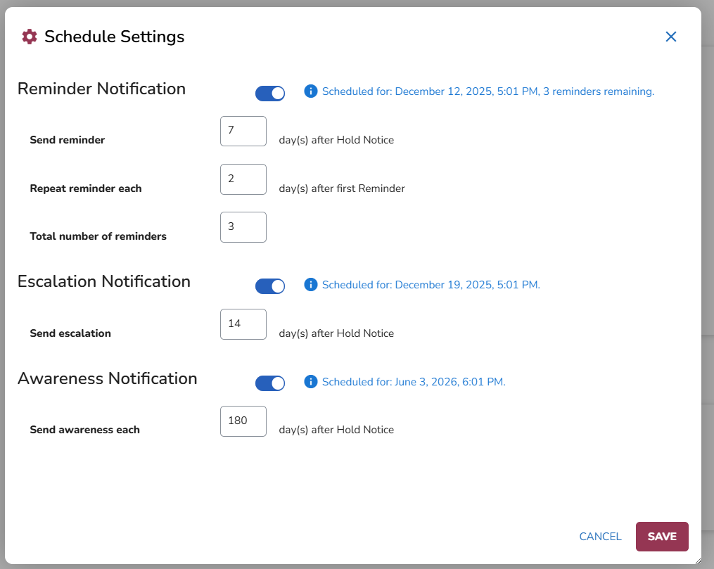 The Settings tab enables the Global Hold manager to set the notification schedule according to their company procedures.
