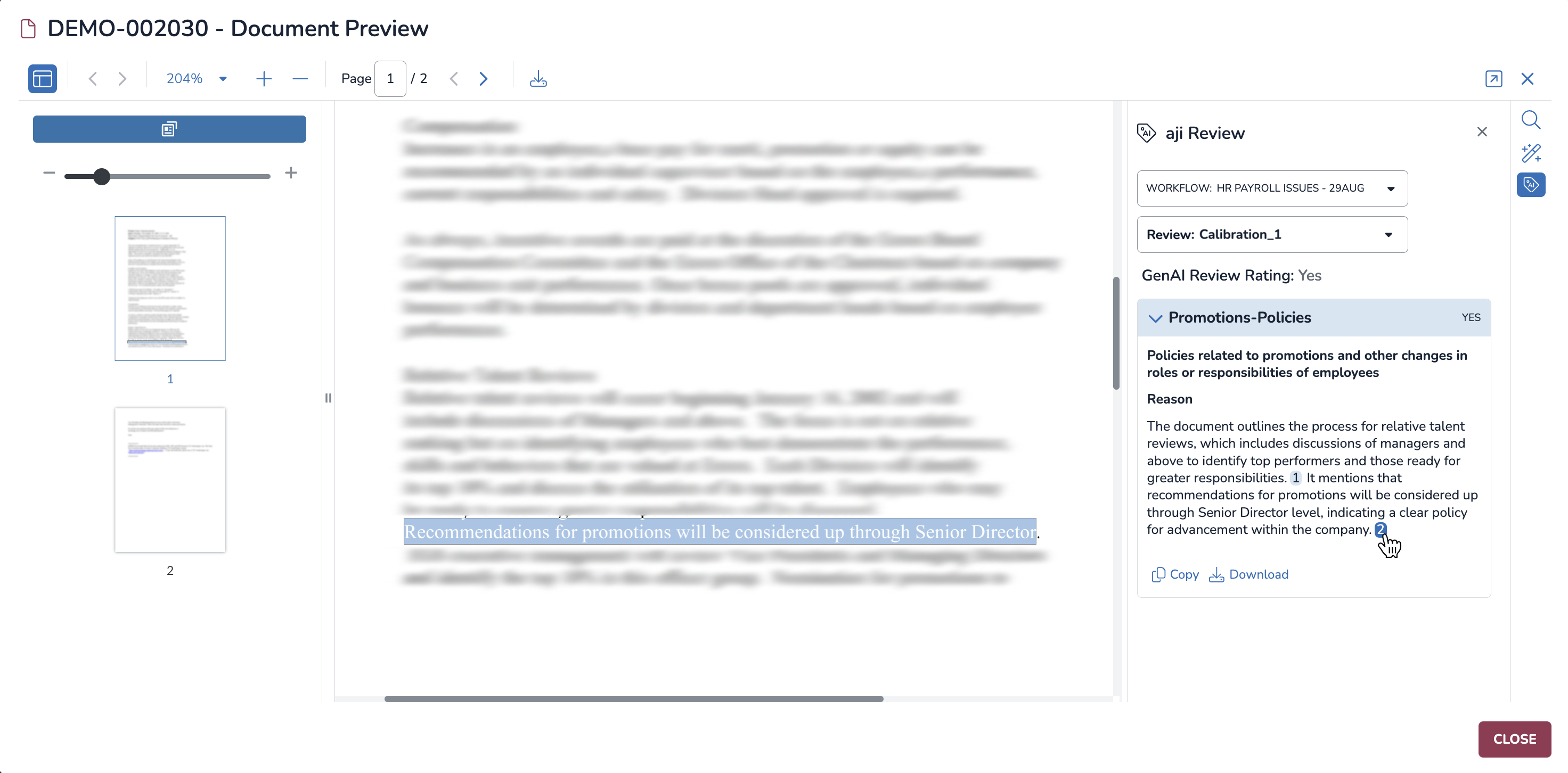 The Document Preview window lets you see the overall GenAI Review rating, individual Definitions with their GenAI rating, reasonings, and citations.