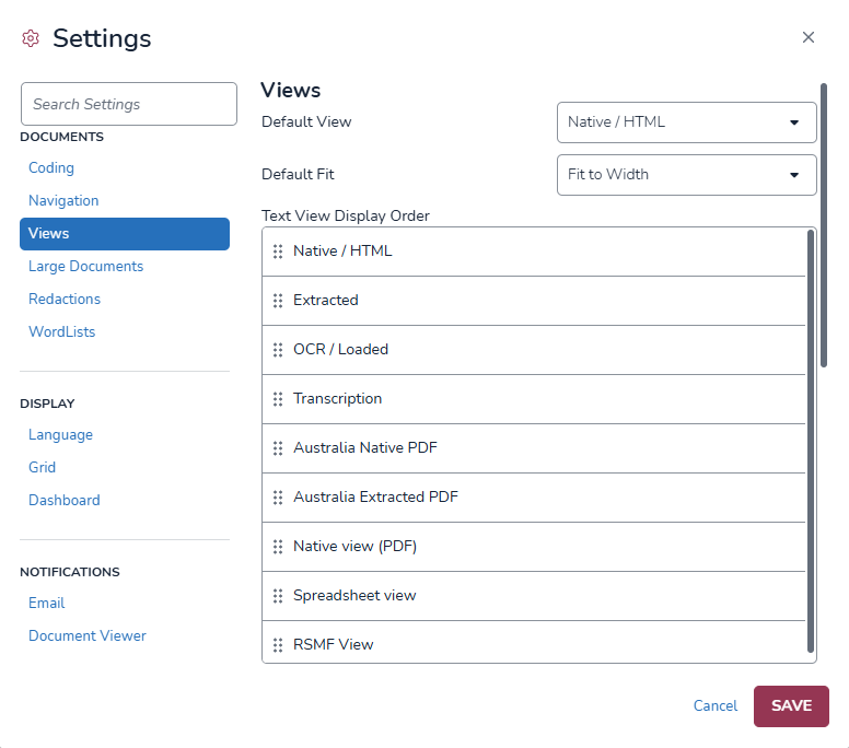 Views - Sets default text set to be displayed in the Document Review screen viewer, the default Image Set to display where more than one Image Set is present, and as of Reveal 2024.7, the order in which Image views are to be presented. Select the default view in each case, and for the Text Set the display order for the Viewer tabs. Native/HTML has given way to Native PDF/HTML as the default view. Additional settings are available as you scroll down below to further specify the display of the text set selected.