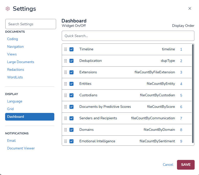 Dashboard allows the user to customize the display and order of all graphical widgets on the dashboard. For any of the following items (or any that may be added to the Dashboard), check or uncheck Widget On/Off for the item to control its display, and either drag the handle at the left or enter its numerical Display Order at the right: