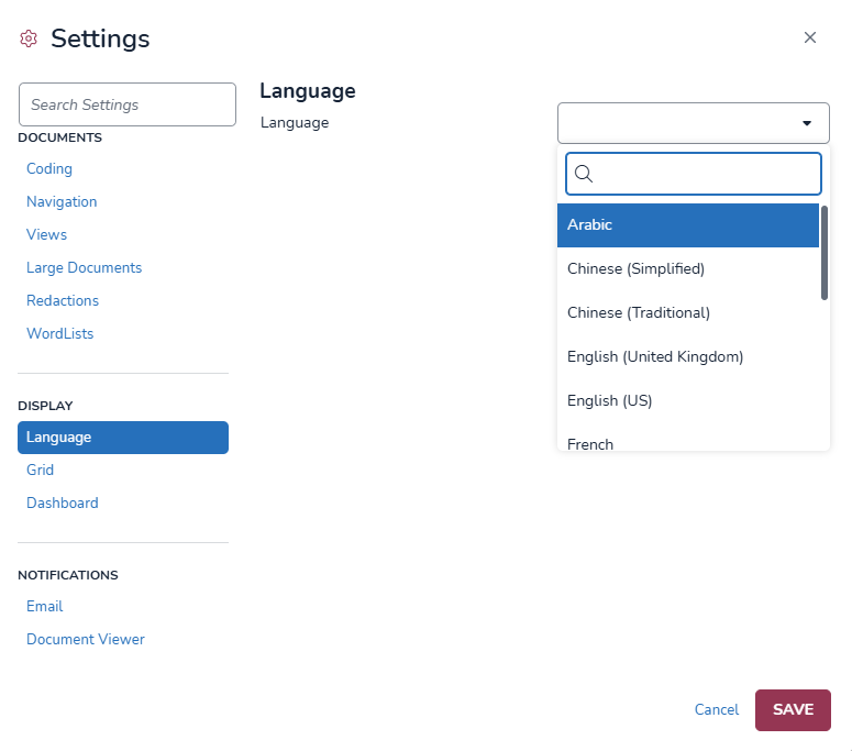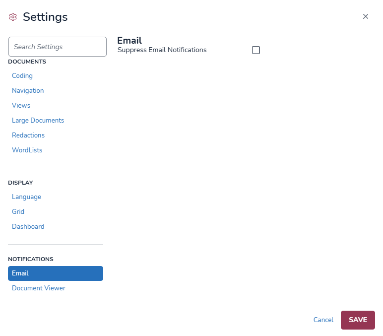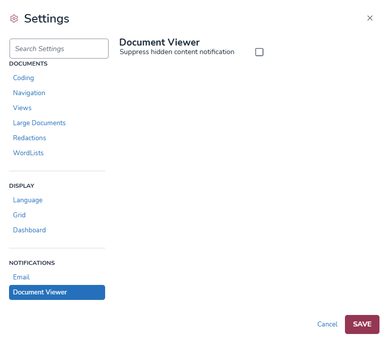 There are three sections in the Settings screen: DOCUMENTS, DISPLAY and NOTIFICATIONS. The Settings screen contains a Search Settings box to quickly find an item within any of them. Click Save after making any change to set it.