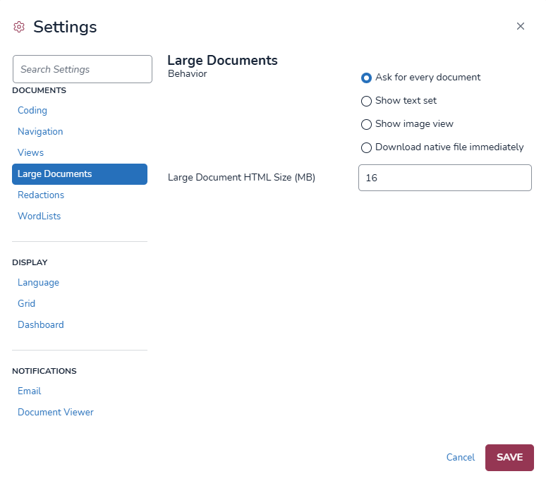 Large Documents - Sets the size threshold and action to be taken in handing a large document during review.