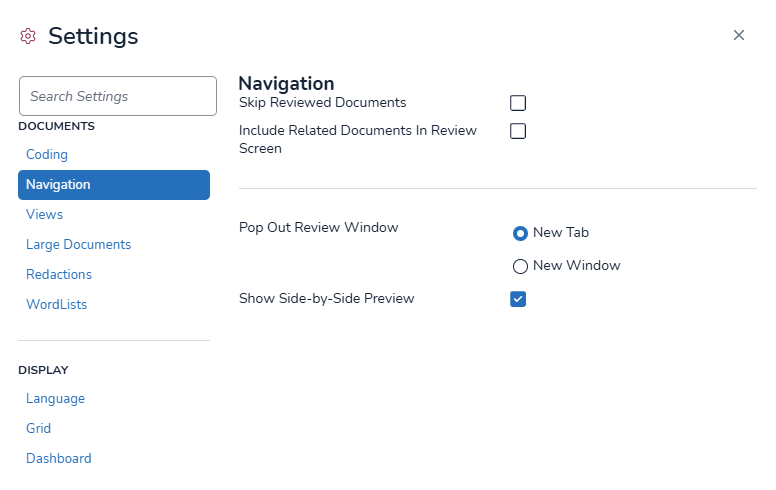 Include Related Documents in Review Screen adds a Related Documents pane in the Document Review screen where a custom relationship field is present in the current Field Profile and populated with the same value as other documents.