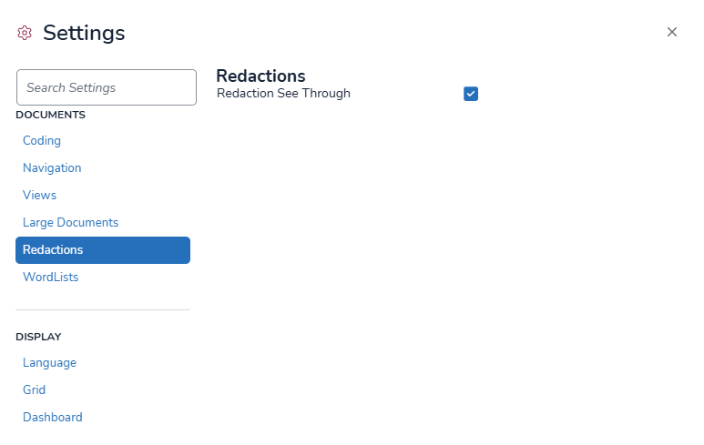 Redactions - A single choice, Redactions See Through, affords the reviewer the ability to see the content being redacted during review. Redactions are rendered opaque and underlying text is removed upon production. Default: On.