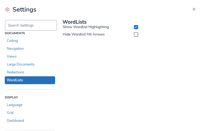 Wordlists - Settings regarding defined Wordlist highlighting and navigation in the Document Review screen.