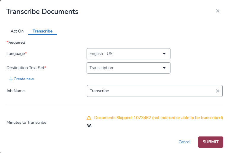 Users can preview the total media duration before submission. A warning appears for any unindexed documents or documents that cannot be transcribed.